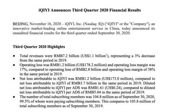 但有意思的是,2020年爱奇艺第一季度会员数量为1.19亿,第二季度会员数量为1.05亿,因此第二季度爱奇艺会员环比降低12%,而第三季度的会员规模1.048亿环比第二季度同样是减少的。也就是说,今年第二、第三季度中,爱奇艺订阅会员数一直呈下降趋势。