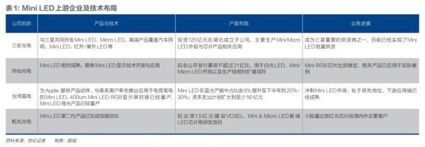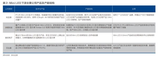 产业链上游的芯片厂家三安光电(600703.SH)、聚飞光电(300303.SZ)都在公告中宣布开始量产Mini LED芯片。TCL的面板企业华星光电将Mini LED的研发和生产重点放在电竞屏、车载屏和电视屏幕上。京东方也开始积极布局Mini LED,将其作为公司重点项目。