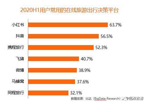 比达咨询发布的《2020上半年度中国旅游行业分析报告》显示,2020上半年度,生活方式社区小红书是用户最常使用的旅游出行决策平台,有63.7%用户使用;其次是抖音,有56.5%的用户使用。