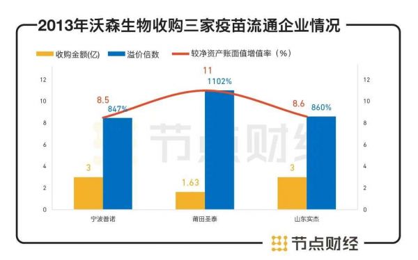 2013年7月,沃森生物以7.63亿元收购了三家疫苗流通企业100%股权,分别是以3亿元收购的宁波普诺,以1.63亿元收购的莆田圣泰,以3亿元收购的山东实杰。较净资产账面值增值率分别为847%、1102%和860%,照此计算,溢价分别为8.5倍、11倍和8.6倍。