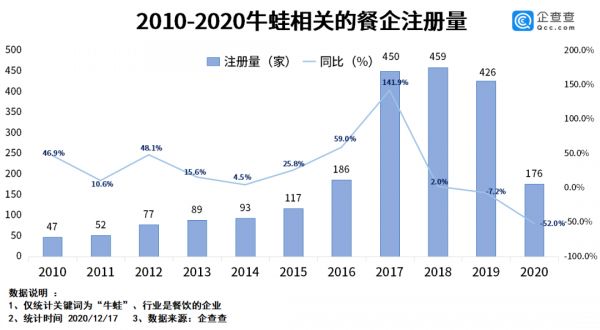 将时间拉回几年前,牛蛙单品“来势汹汹”。企查查数据显示,我国“牛蛙”相关企业在2017年出现大幅增长,且在2017-2019年间,每年新注册量均超过400家。