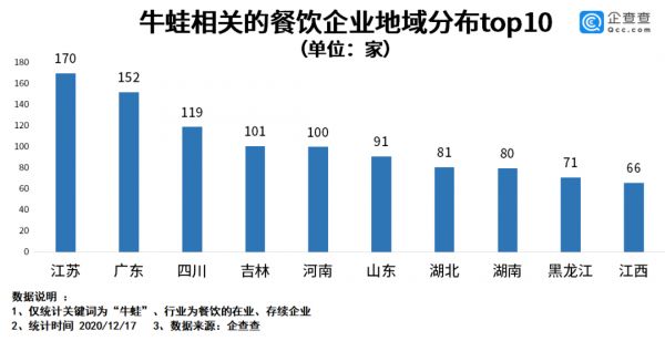企查查数据显示,截止今年12月15日,我国共有牛蛙相关的餐饮企业1486家,江苏以170家企业排名第一,广东、四川分列二三名。牛蛙餐厅多发展于南方城市,主要是由于牛蛙产地多集中于广东、福建等沿海一带,因各地区产季不同,具有明显的季节性。