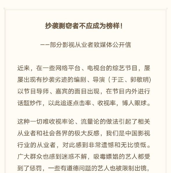 最新引发群怼的是111位编剧、导演、制片人、作家的联名信,点名有抄袭劣迹的郭敬明、于正不仅没有对黑历史公开道歉,还频频在综艺节目中进行话题炒作,严重带歪了社会风气,呼吁平台立即停止对这些“劣迹从业者”的宣传炒作,对相关节目做出修改调整,不给抄袭剽窃者提供舞台,将他们从公众媒体中驱逐出去。