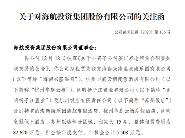 12月22日,深交所对海航投资下发关注函,六问公司近期的经营疑点,包括对公司以8.26亿元租赁关联方持有的海南康乐园海航度假酒店、杭州华庭云栖度假酒店、昆明皇冠假日酒店和苏州饭店部分区域15年的交易等。
