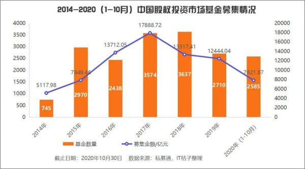 私募通数据显示,截止 2020 年 10 月,中国股权投资市场新成立基金数量与募集资金总量出现「三连降」——新募资基金数量连年减少,从 2018 年的 3637 只减少至 2020 年的 2585 只;募集总金额持续缩水,从 2018 年总募集金额超过了 1 万 3 千亿减少至 2020 年不足 8000 亿元。虽然 2020 年还有最后两个月的数据未被公开,但想要在募集金额上赶超 2019 年的 1.2 万亿怕是十分困难。