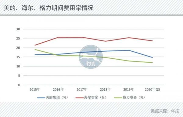 据豹变统计,2015到2019年近5年来,美的平均期间费用率为17.4%,格力为15.64%,而海尔则高达25.26%。2020年前三季度,美的、格力与海尔的期间费用率分别为14.64%、12.01%和23.7%。海尔的费用率明显较高。