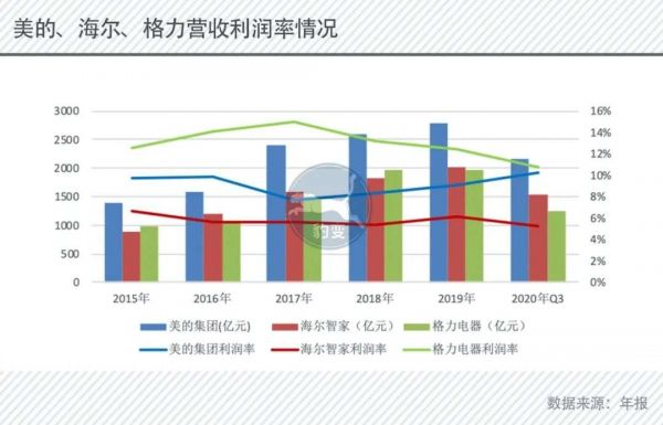 费用的高企,导致利润被侵蚀。2020年前三季度,美的、格力与海尔,分别实现营收2167.61亿元、1258.89亿元和1544.12亿元,营收规模上海尔并不弱,但利润率却比友商低,只有5.19%,是两家友商的一半。
