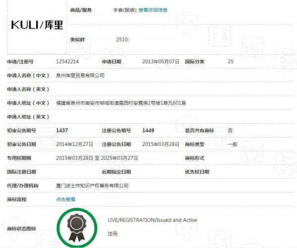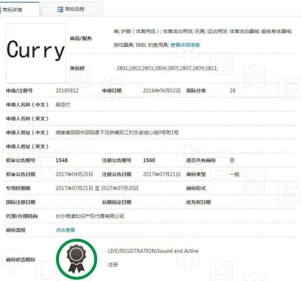 体育大生意记者通过国家知识产权局官网进行查询发现,注册“库里”二字的商标有上百个之多。最早的商标可以追溯到2013年,商标申请者后来干脆在2015年注册了泉州库里贸易有限公司,通过该公司又注册了多个有关库里的商标。而随着2015年夏库里首次赢得NBA常规赛MVP并带队夺得NBA总冠军,库里的商标抢注也达到高潮。除了有百余个库里二字的商标外,还有大量类似“库里三分”、“库里兄弟”等字样的商标。此外,2017年,库里的英文姓氏“Curry”也被抢注,类别主要是体育用品。