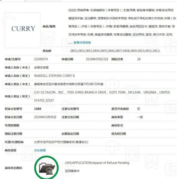 据体育大生意了解,库里委托的相关律师在2019年就针对Curry这个商标向国家知识产权局提起无效宣告申请,同时也申请注册自己的Curry专属商标(申请注册号:31096974)。但却被国家知识产权局以该商标与现有商标高度相似为由予以驳回。