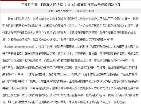 库里方面甚至为此还援引了最高法行再27号行政判决书,即乔丹诉乔丹体育案。当时最高法院通过大量的媒体报道认定,乔丹的知名范围已不仅仅局限于篮球运动领域,而是已成为具有较高知名度的公众人物,所以我国文字中的乔丹即代表NBA球星迈克尔-乔丹。