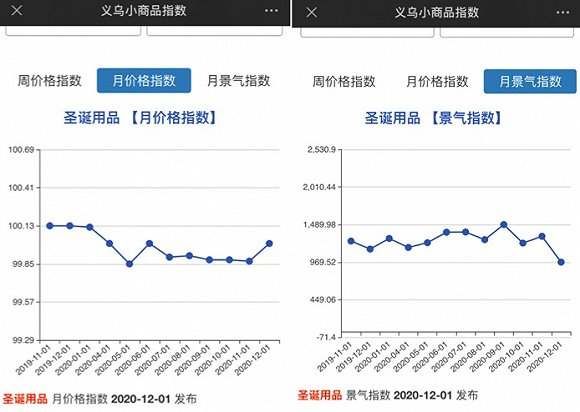 界面新闻获得的义乌小商品圣诞价格和景气指数显示,过去一年(2019年11月1日-2020年12月1日)圣诞用品的月价格指数趋势显示,圣诞用品价格从去年11月滑落至今年5月,6月逐步回暖,在今年12月明显增长,但未能达到去年同期的价格;景气指数则是在今年9月达到峰值,此后折线式回落,至今年12月到低谷。