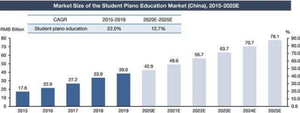 中国学生钢琴教育市场从2015年的176亿元人民币快速增长到2019年的390亿元人民币,复合年增长率为22.0%,预计到2025年其规模将翻一番,达到781亿元人民币。2019年,钢琴教育市场规模将翻一番。就支出而言,教育占中国学生乐器培训市场的68.8%,按学生人数计算,2019年占市场的66.6%。预计到2025年,这些比例将分别增加到71.0%和69.0%。