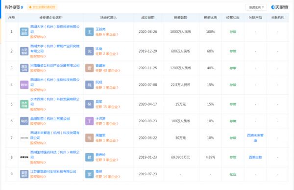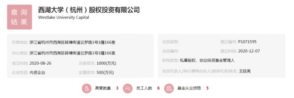 天眼查显示,西湖大学(杭州)股权投资有限公司成立于2020年8月26日,注册资本为1000万元人民币,登记的英文公司名为Westlake University Capital。值得一提的是,该公司为西湖大学全资子公司,校长便是著名的科学家施一公。