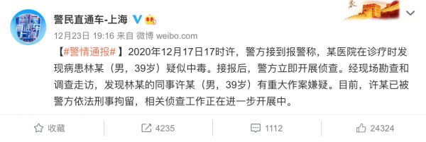 但就在几个小时以后,上海警方的通报则暴露了更多关于案件的细节,2020年12月17日17时许,警方接到报警称,某医院在诊疗时发现病患林某(男,39岁)疑似中毒。