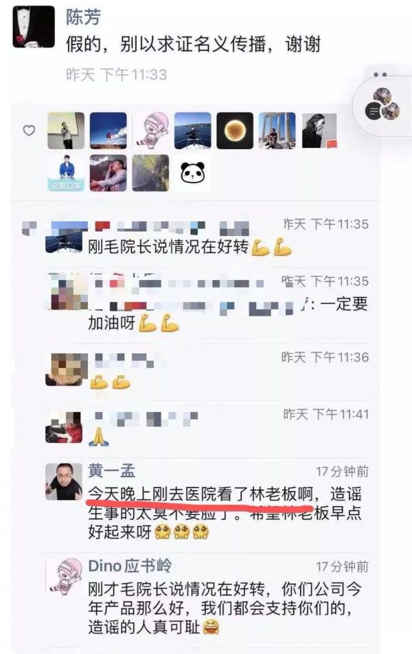 针对此截图,游族网络副总经理陈芳曾连续两次在社交媒体辟谣称,此为“假消息”,“流言才是毒药”。最终,游族网络发布自愿性公告称,林奇因身体不适入院,经治疗目前身体状况稳定并在持续好转。