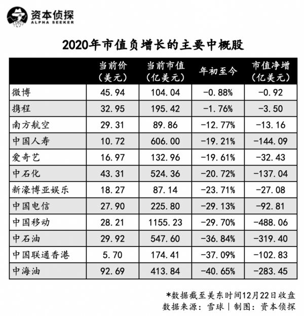 不过,即使在市场的狂欢情绪中,美股的风格依旧非常明显——偏爱新经济、新概念,对传统行业兴致缺缺。在规模较大的中概股中,2020年出现市值负增长的企业主要分布在石油石化、运营商、航空、保险等传统行业。