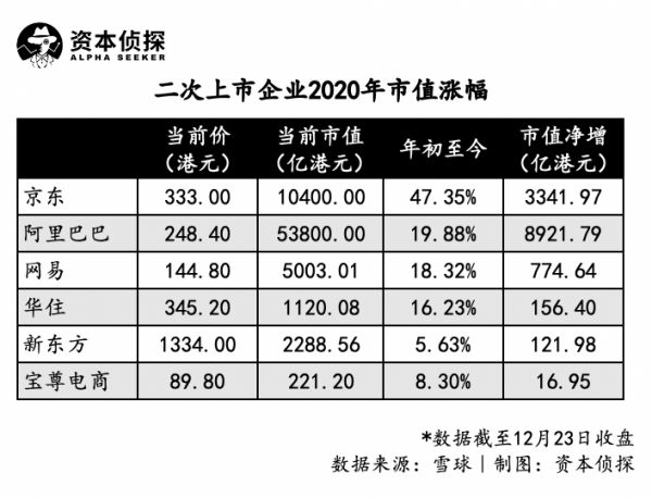 此外,港股市场另一个比较出人意料的现象是,一度让市场沸腾的中概股回港二次上市潮,从增长趋势看,似乎并没有掀起过多的波澜。回港二次上市企业中,涨幅最大的是京东,但放在整个市场中来看其47%的涨幅并不算突出。阿里巴巴、网易、华住、新东方、宝尊都表现平平。