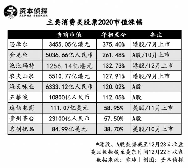 A股则偏爱国民品牌,无论是金龙鱼、海天味业,还是五粮液、茅台,都是家喻户晓、与日常饮食生活息息相关的消费品牌。在这些品牌中,茅台可谓A股的大霸主,今年伴随着白酒板块普涨的趋势,茅台也不断创下新高,市值已达到2.3万亿人民币。
