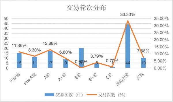 从融资轮次看,项目集中在战略投资(44笔,占33.33%),其次是A轮(17笔,占比12.88%)。其中战略投资一直保持热度。