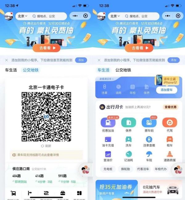 目前“出行服务”的主要内容分为“车生活”和“公交地铁”两大板块,其中“车生活”主要是指车主服务内容,整合了加油、代驾、保养、洗车、违章查缴、挪车、租车等服务内容,而“公交地铁”则是靠腾讯乘车码实现,并整合公交实时路线信息。此外,目前在广州地区,除了“车生活”和“公交地铁”外,还有“打车”服务板块,页面显示该服务由如祺出行提供;在西安地区,还与当地交通主管部门联合提供了“出租车”服务。