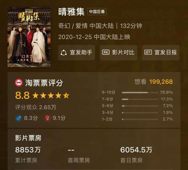 然而,《晴雅集》即使不被看好,可在映前的攻坚战中,无疑它还是取得初步胜利的。6500万元的总预售、点映票房,放在整个变幻莫测的2020年都是耀眼战绩。截至发稿,《晴雅集》首日获得9500万左右的票房,破亿的单日票房近在咫尺,超过猫眼专业版给出的7900万预测成绩,位居圣诞档票房亚军。同时,《晴雅集》在微博电影、抖音电影榜热度位居第一,首日上座率、观影人次均有亮眼数据。口碑方面,郭敬明的电影更是有了历史性的突破。