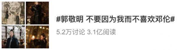 12月11日,话题#郭敬明 不要因为我而不喜欢邓伦#登上微博热搜。邓伦在微博安利《晴雅集》时,被粉丝吐槽“喜欢你,但是不喜欢郭敬明”,这本是平常言论,却被敏感的郭敬明点名翻牌。郭敬明回复:“不要因为我而不喜欢伦哥,伦哥是无辜的,他的第一部电影请多多支持,也给我一个机会”。郭敬明“自我开会”式发言被网友暗讽苦肉计。