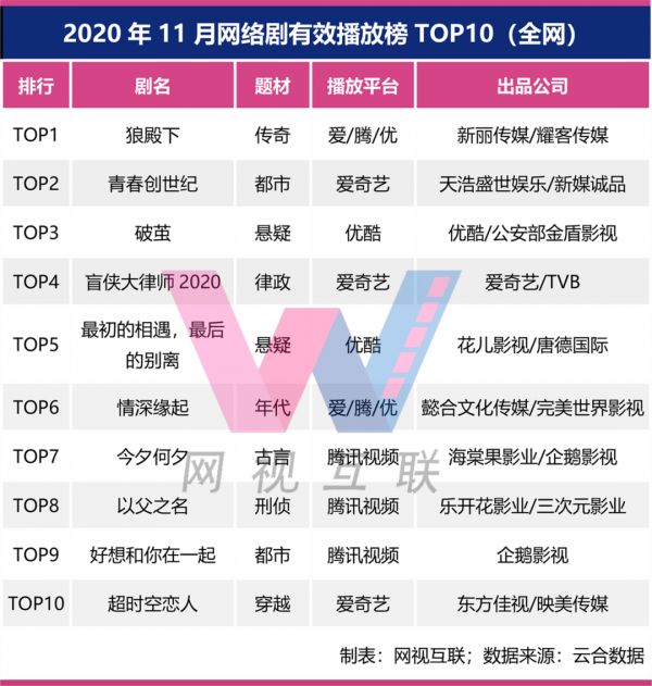 根据云合数据提供的有效播放数据,网视互联(ID:wxs360)整理出了11月份网剧有效播放排行榜TOP10。