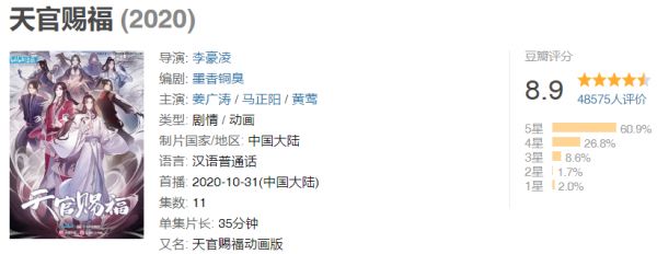 不过10月31日在B站上线的《天官赐福》动画版,反响非常强烈,豆瓣评分8.9(甚至一度达到9.2分),好评如潮。