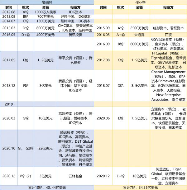 今年6月,作业帮6月宣布完成7.5亿美元E轮融资,也于今年10月被传或将完成新一轮融资。但后一轮轮融资消息始终未见正式披露,直至12月28日,作业帮官宣完成E+轮超16亿美元融资,而此轮融资的投资方包括阿里巴巴、Tiger Global、软银愿景基金一期、红杉资本中国基金、方源资本等。