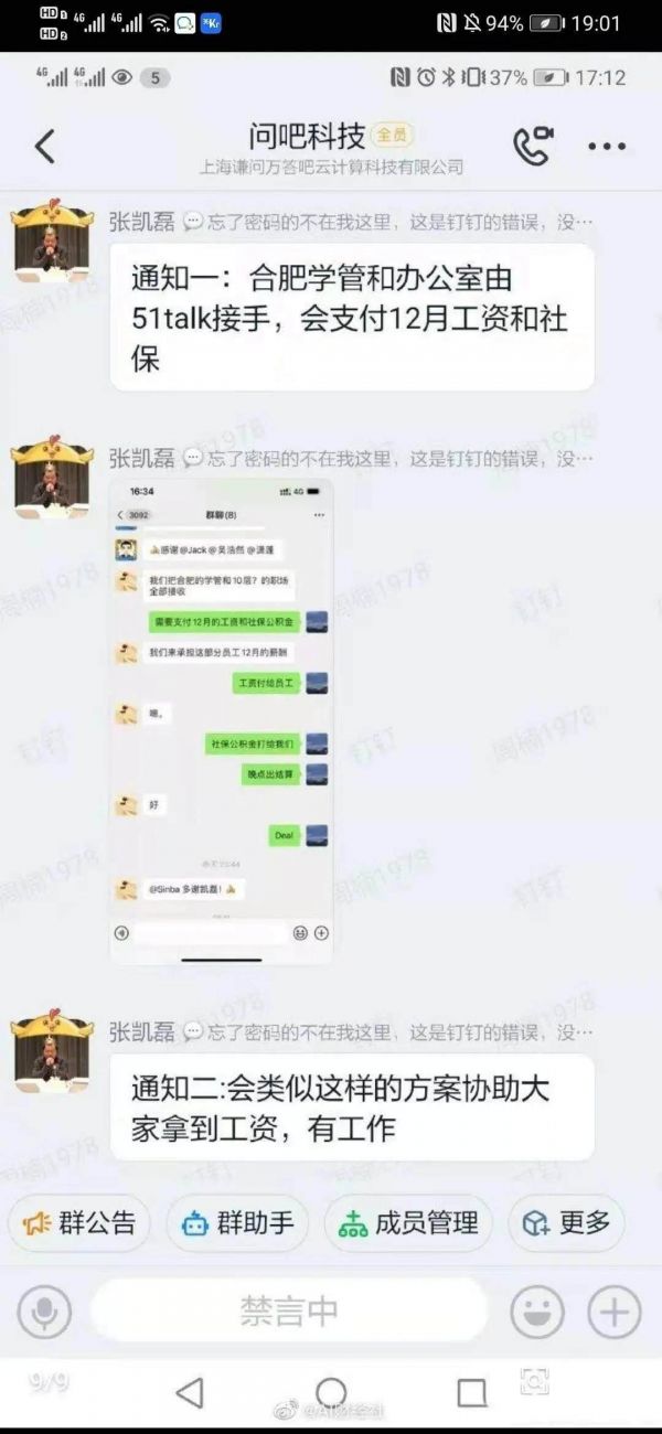 学霸君创始人张凯磊在工作群称:通知一,合肥学管和办公司由51talk公司接受,会支付工资和社保。通知二,会类似这样的方案协助大家拿到工资,有工作。