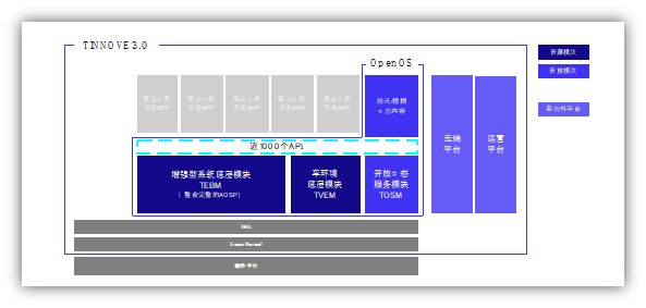 其中,TINNOVE OpenOS车载操作系统专门针对安卓系统适配体验差,重复投入问题而开发,包含增强型系统底层模块TEBM、车环境底层模块TVEM、开放生态服务模块TOSM三大模块。