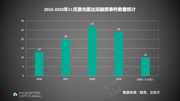 2020年1-11月投融资事件数量,虽未有上升,共10起,但3家明星企业,禾赛、速腾、镭神均完成新一轮融资,其中,禾赛科技C轮融资额达1.73亿美元。纵观2016-2020年,融资事件数量于2018年达到峰值,共27起,随后开始下降。主要受自动驾驶商业化落地周期长,投资更理性的影响。