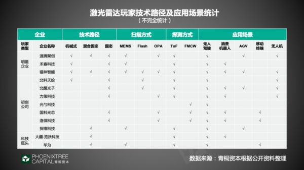 激光雷达玩家,国内目前共46家入局。其中,3家明星企业入局较早,融资进入中后期,包括速腾、禾赛、镭神;另外也有初创公司专注前瞻技术,如北醒、北科天绘、国科光芯等。以采用FMCW技术的公司为例,目前仅3家,据公司官方数据,洛微已初步完成样品;光勺计划今年第4季度实现量产。这些企业都属于激光雷达领域的“原住民”,其在技术路径、扫描方式、探测方式、应用场景上的方案详见下图。