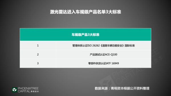 第三,能否通过车规级测试。激光雷达产品达到车规级,需通过3个标准认证,进行车规振动、冲击、温度循环等试验。目前,国外仅法雷奥SCALA是唯一量产的车规级激光雷达;2020年11月,镭神智能CH32混合固态激光雷达,在国内率先通过车规级认证。