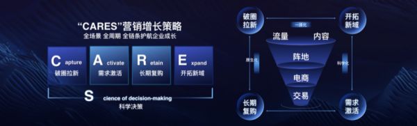 如在引擎大会2021上,巨量引擎全新打造的“CARES"营销增长模型(Capture 破圈拉新、Expand 开拓新域、Activate 需求激活、Retain长期复购、Science of decision-making科学决策),就能够深入到企业经营全周期,无论是针对新人群的突破期和开拓期,还是针对已有用户的经营期和深耕期,都能找到科学的解决方案,激发企业生意增长全场景。“CARES"营销增长战略连接着企业经营中流量、内容、阵地、电商、交易等全链条,可以从全场景、全周期、全链条地护航企业成长。