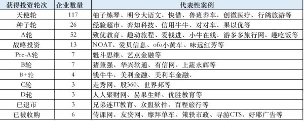 在今年死亡的近千家企业中,有18%左右的企业进行过融资披露。其中,有143家企业获得天使轮/种子轮投资。52家企业获得 A 轮融资。已被收购企业有6家,分别为传课网、友贷网、摩拜单车、策轶市政、寻游CTS、好耶广告等,已退市企业有3家,分别为兄弟连IT教育、众盟软件、百程旅行。