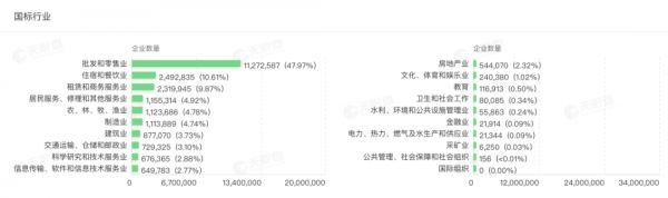 按国标行业分类,批发和零售业、住宿和餐饮业、租赁和商务服务业位于前三名。其中,批发和零售业以47.97%的高占比居于首位。制造业企业注册数为1113889家,占比4.74%。交通运输、仓储和邮政业企业注册数为729325家,占比3.1%。科学研究和技术服务业、信息传输、软件和信息技术服务业的注册企业数为676365家、649783家。金融业注册数寥寥,21914家占比仅为0.09%。