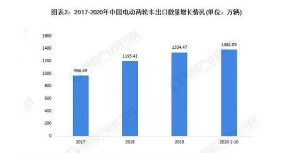 不过,中国作为世界上最大的电动自行车生产、消费和出口国,国内外需求的持续增长为我国电动自行车行业迎来发展机遇。相关数据显示,在出口方面,2017-2020年,我国电动两轮车的出口数量逐年增长,2020年1-10月,出口数量已达2019年全年水平,共出口了1382.09万辆,表明我国电动两轮车的外贸出口市场增长强劲。