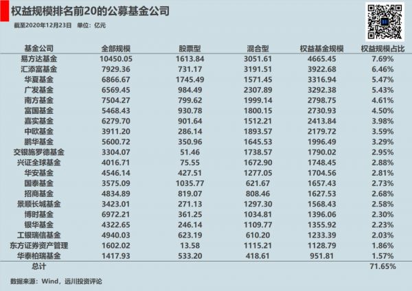 但增长也是结构性的,基金行业的集中度在头部效应中显著提升。全行业143家公募基金公司,管理6万亿权益基金,其中权益规模排名前20的基金公司一共占据了整个行业超过7成的体量。光是易方达一家的权益体量就足以和50名开外所有基金公司的权益规模总和相抗衡。