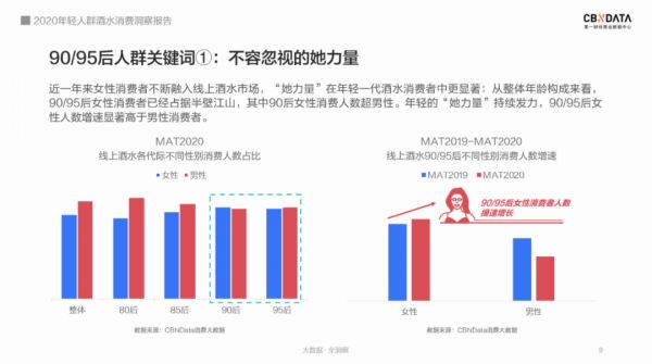 CBNData发布的《2020年轻人群酒水消费洞察报告》中显示,无论是消费人数还是人均消费水平,90、95后消费者都呈现持续增长,其中以95后的人均消费增速提升最快,“小酒鬼”们正在逐渐成为线上酒水消费市场的主力。