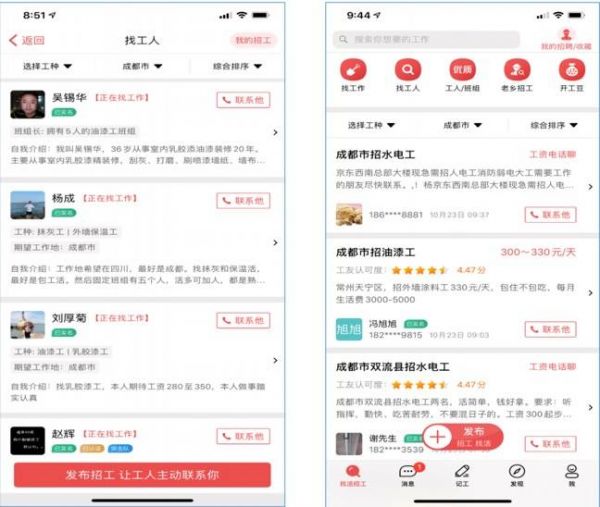 吉工家App招工/应聘界面。左图为工头端界面,右图为工人端界面
