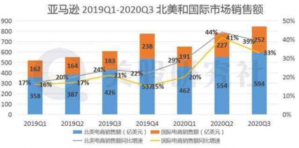 受宅家经济利好,亚马逊的业绩增长非常明显,根据发布的财报来看,Q1-Q3季度亚马逊营收分别为755亿美元、889亿美元、961亿美元。以Q3季度来看,亚马逊线上净销售额为483.50亿美元,同比增长58%,再度创下历史新高。