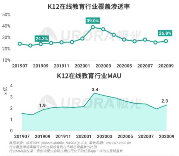 根据极光大数据发布的《2020年K12在线教育行业数据研究报告》显示,在线教育行业渗透率及月活在2020年2月达到一年的峰值,分别为39%和3.4亿,3月行业人均时长最高达单月4小时,而到了9月,人均时长却呈现下降趋势。