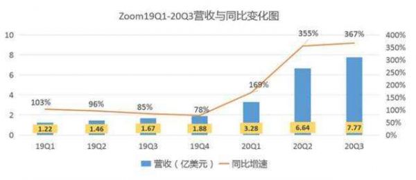 今年年内Zoom涨幅超500%,连续三个季度大幅盈利和营收爆发增长。根据Zoom今年披露的业绩来看,Q1-Q3季度营收分别为3.28亿美元、6.64亿美元、7.77亿美元。