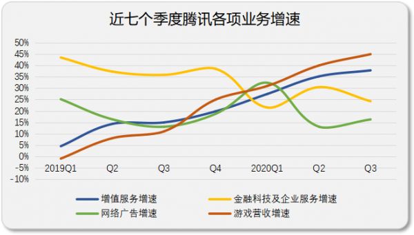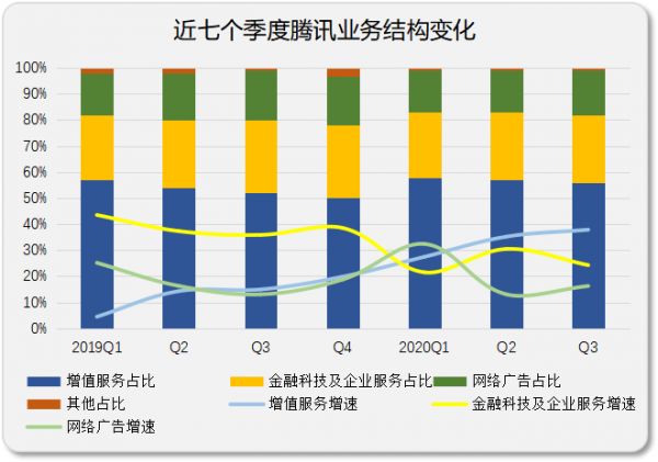 微信上线视频号、整合看点等信息流产品,前三季度网络广告营收同比增速不足20%。数字大会刷屏的企业服务业务,加上金融,前三季度该业务还是未能取得25%的增长。相反,低调的增值服务前三季度营收却同比增长近34%。