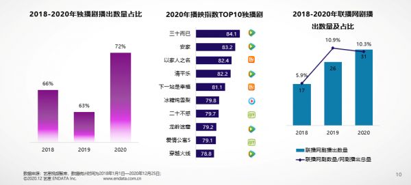 以腾讯视频为例,今年新上线的独播剧数量较去年增加了29%,达到48部。在播映指数TOP10的独播剧中,腾讯视频独播剧占据了5个席位(《三十而已》《安家》《清平乐》《龙岭迷窟》《穿越火线》),在4大网络视频平台中领跑独播剧市场。