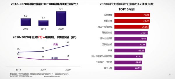2020年,一个令人稍稍欣喜的消息是,国产剧的整体口碑有所提升,播映指数top100剧集的平均豆瓣评分为6.4分,去年的平均分是6.1。