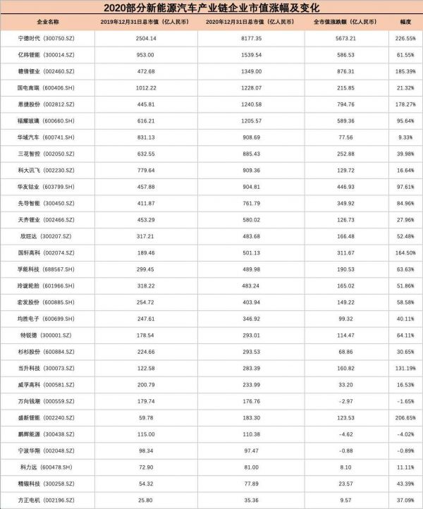 与此同时,新能源汽车产业链上下游个股也受到资本追捧。如,动力电池龙头企业宁德时代(300750.SZ)一骑绝尘,股价在2020年内涨幅超186%,是创业板史上首支市值突破7000亿元的股票,成功跻身A股上市公司市值前十。