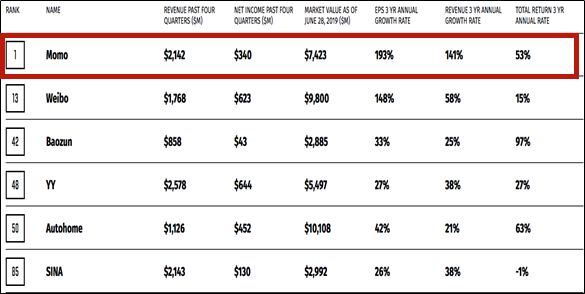 2019年,100家增长最快的公司排行榜中,陌陌排名第一,这也是中国公司首次登顶。