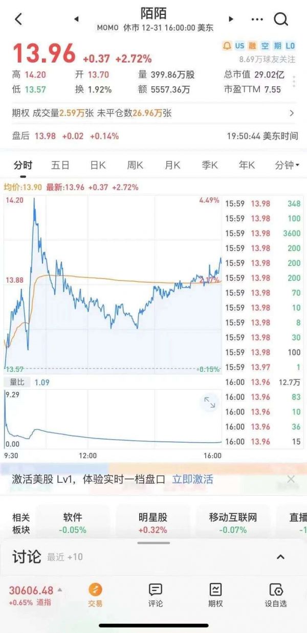 截至2020年12月31日收盘,陌陌股价为13.96美元/股,总市值29.02亿美元,约等于190亿人民币。